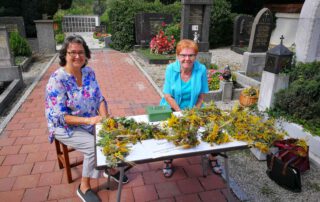 Dass es auch in diesem Jahr wieder zu Maria Himmelfahrt Kräuterbuschn zum Weihen geben soll, trotz all der Einschränkungen, darüber war man sich von Anfang an einig. Aufgeteilt in mehreren Fahrzeugen ging man am Donnerstag vor Maria Himmelfahrt bereits in den frühen Morgenstunden unter der fachkundigen Leitung von Christl Wind und Hannelore Engl rund um Unterföhring auf die Suche nach Kräutern. Nach 3 Stunden waren alle mitgebrachten Behälter voll von 21 gesammelten Kräutern. Tags darauf wurden diese dann im Innenhof des Kath. Pfarrzentrums zu 145 Sträußen verarbeitet. Eingebunden wurden Thymian, Majoran, Lavendel, Ringelblume, Schafgarbe, Rainfarn, Goldrute, Boretsch, Wegwarte, Hafer, Gerste, Weizen, Johanneskraut, Salbei, Oregano, Königskerze, Kamille, Bibernelle, Rosmarin, Zitronenmelisse, Kapuzinerkresse und Pfefferminze.
