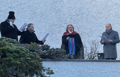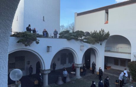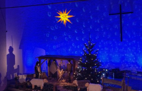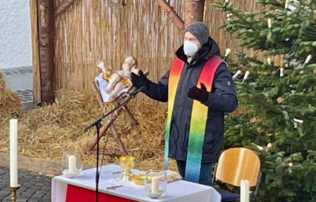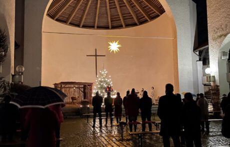 - statt einer Christmette am späten Abend mit vielen Menschen, im geschützten Kirchenraum trafen wir uns am frühen Abend im Innenhof unserer Kirche im kleineren Kreis unter freiem Himmel, bei Kerzenschein und Nieselregeund feierten – mit Blick auf das Kind im Stall – Weihnachten.