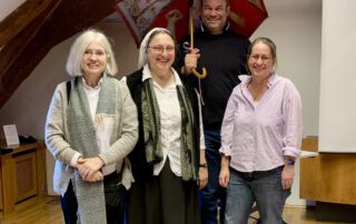 Mit professioneller Erfahrung und in sehr anregender Weise hat Sr. Gratia auch diesmal das Thema didaktisch aufbereitet und anschaulich gestaltet sowie durch Spaziergänge auf den Kiesbänken der Donau erweitert und uns den Wandel als Konstante im Leben bewusst gemacht. Für ihre Arbeit gebührt ihr an dieser Stelle nochmal unser herzlicher Dank! Thomas Bachinger spielte für sie ein Abschiedslied auf der Mundharmonika und Barbara Buhn als Organisatorin dankte ihr – passend zur vorherrschenden Witterung – mit einem wunderbaren roten Schirm mit innenseitigem Aufdruck von Malereien aus dem Ismaninger Schloss. Vielen Dank auch an Barbara fürs Organisieren des Besinnungswochenendes und an Pfarrer Dr. Brunner, der diesen Weg des „Besinnens“ mit uns gegangen ist, und an alle, die mit ihrer Teilnahme die Veranstaltung bereichert und die Gemeinschaft gepflegthaben.