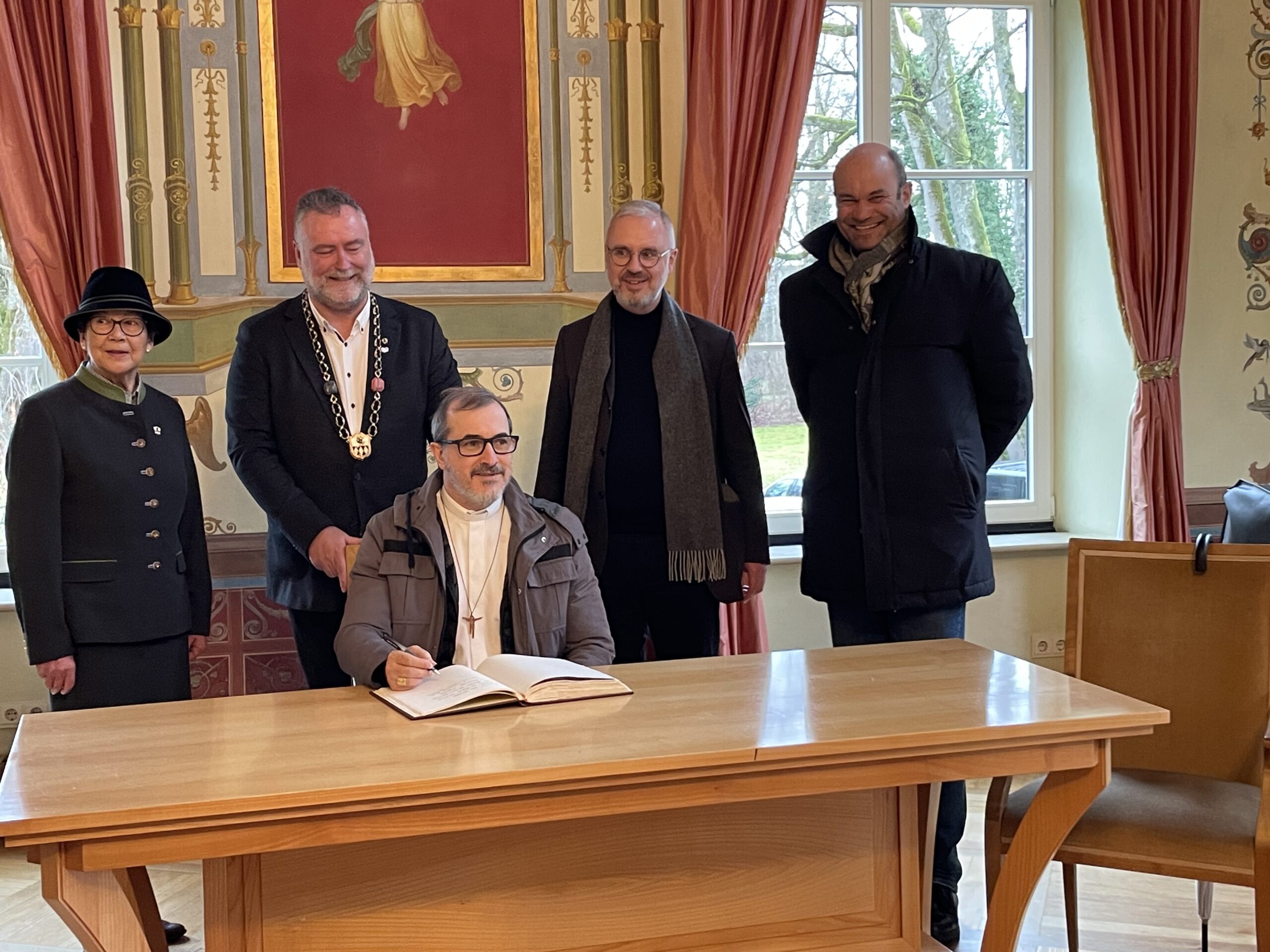 Zum Abschluss seines Besuches empfing Bürgermeister Dr. Greulich den Bischof im Rathaus. Dort trug er sich als Zeichen der Wertschätzung und Verbundenheit in das Goldene Buch der Gemeinde Ismaning ein.